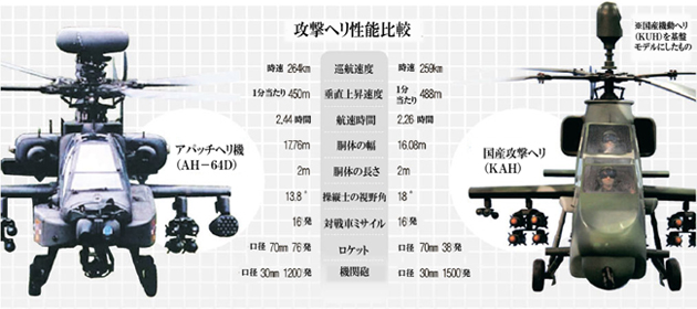問題は国産攻撃ヘリコプターだ。2010年ごろに攻撃ヘリコプターの開発に着手した場合、従来のコブラヘリ機が淘汰される2018年には生産が可能だとみられていた。専門家らはしかし、アパッチヘリコプター輸入が推進されれば、限られた国防予算構造上、国産攻撃ヘリコプター開発は廃棄または縮小されると考えている。この場合、攻撃ヘリコプターはずっと外国に依存しなければならない状況になる。
