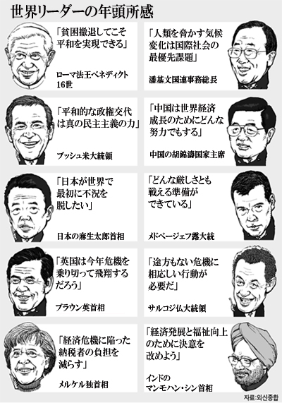 ◇国際社会の連携を強調=国連の潘基文(パン・ギムン)事務総長は1日、韓国の国民あてに送った新年のあいさつで「人類と地球全体の未来を脅かす気候変化は、国境と人種を超え、すべての国際社会がともに解決して行かねばならない最も急がれる課題だ」とした後「09年を‘気候変化の年’に指定した」と伝えた。続いて「国際社会は世界経済のベスト10に入る韓国に、それに相応しい役割と寄与を期待している」とした上で「韓国政府の積極的な参加と支援を望む」と要請した。
