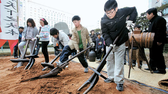 3日、ソウル中区(チュング)農業博物館を訪れた児童が伝統農具「タビ」で田を耕している。「タビ」は青銅器時代から使われた農機具で、1970年代まで山間地域や島嶼で農地を耕す道具として使われた。