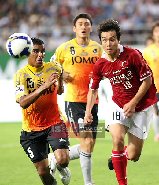 8日、仁川(インチョン)ワールドカップ(W杯)競技場で「2009JOMOカップ韓日プロサッカーオールスター戦」が行われた。韓国のストライカー李東国(イ・ドングク)が日本オールスターのDFジウトンと激しく競り合っている。