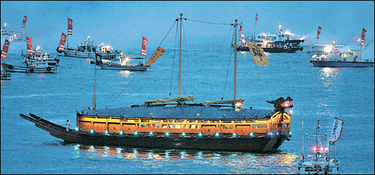 忠武公・李舜臣(イ・スンシン)将軍が475年前に慶尚南道統営閑山島(キョンサンナムド・トンヨン・ハンサンド)沖で倭(日本)の水軍をせん滅した閑山島大捷・鶴翼陣を再現するイベントが15日、閑山島沖で行われた。同午後7時から開かれた同イベントには、05年末、ソウル市が統営市に寄贈した亀の船1隻、統営海洋警察署の警備艦艇16隻、官公署の行政船舶12隻、漁船105隻など計134隻が動員された。