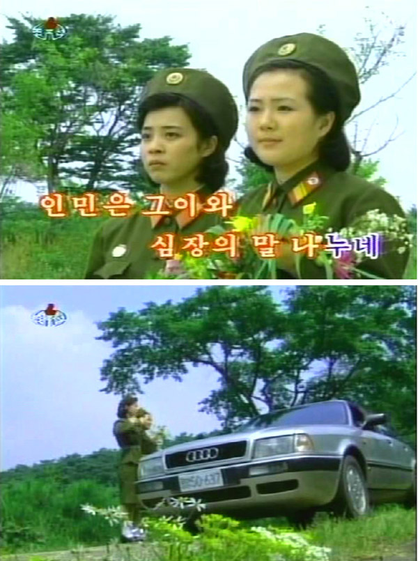 朝鮮中央テレビは30日、金日成(キム・イルソン)銅像がある万寿台(マンスデ)を訪れる住民の切ない感情を表した画面音楽集「首領様がいらっしゃる万寿台」を放送した。 世界的ブランドのドイツ車「アウディ」の隣に立っている女性兵の姿が目を引く。