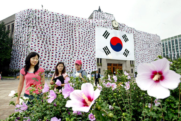 光復(独立)60周年を迎えて、ソウル市庁の本館が、10日、大型の太極旗(テグッキ、韓国の国旗、横17.1メートル、縦11.4メートル)1枚と小型の太極旗(横1.35メートル、縦0.9メートル)3600枚で覆われた。 インスタレーショングループ「CLP」が作った『太極旗を翻して』というタイトルの作品。