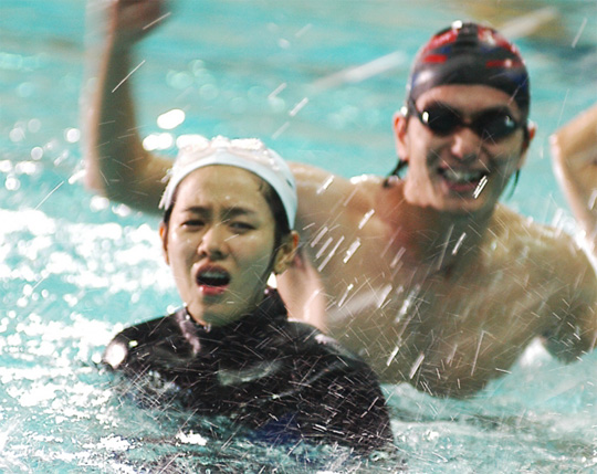 17日に放送される『恋愛時代』第5話のこのシーンは、スポーツセンター会員たちが見守る中、ウンホ(ソン・イェジン)と彼女を執拗に付きまとうヒョンジュン(イ・ジンウク)が互いの水泳の実力をめぐって賭けをするシーン。初盤、水泳選手出身らしくヒョンジュンをリードするソンは、折り返し後、少しずつイ・ジンウクに잒いつかれ、結局ほとんど同時にゴールするが、不当な(?)判定でイ・ジンウクが勝利。イ・ジンウクの願いどおり彼の両親にあいさつをしに行くという内容だ。