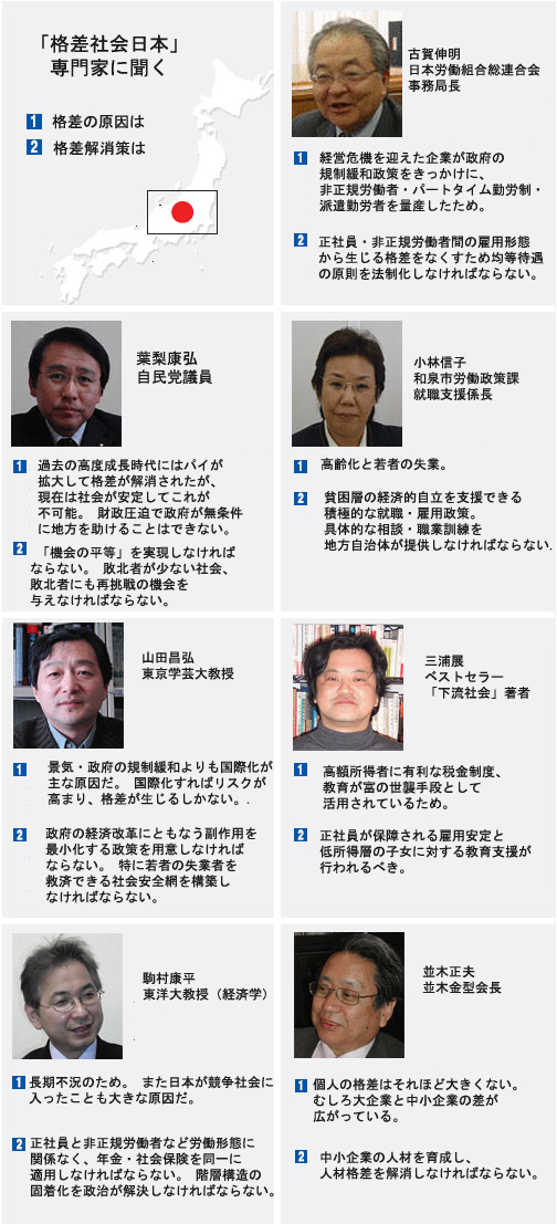 桶口美雄・慶応大教授は「終身雇用神話が崩れたうえ、非正規労働者が正社員になるのが難しく、階層の固着化につながる」と憂慮した。
