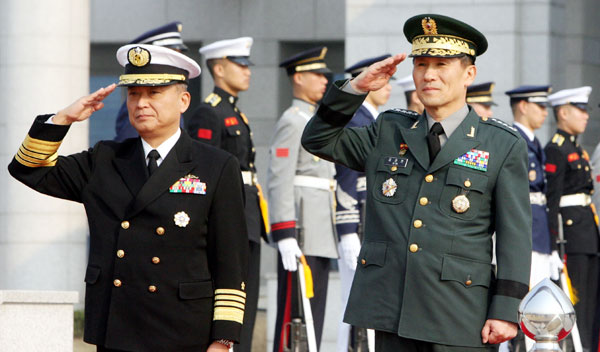 金寬鎮(キム・グァンジン)合同参謀議長(右)と齋藤隆統合幕僚長が15日、ソウル竜山(ヨンサン)国防部練兵場で儀仗隊を査閲している。斎藤統合幕僚長の訪韓は06年3月の日本統合幕僚監部発足後初めて。