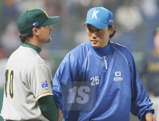 8日、台湾台中のインターコンチネンタル球場で北京五輪野球予選、韓国-オーストラリアの試合が行われた。韓国が16-2でオーストラリアにコールド勝ちをおさめた。試合終了後、李承燁とオーストラリアのグレイ投手と握手を交わしている。