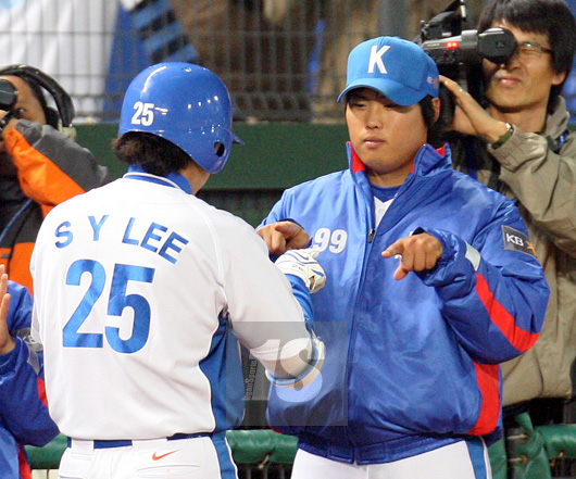 8日、台湾タイ中インターコンチネンタル球場で北京五輪野球最終予選、韓国-オーストラリア戦が行われた。李承燁(イ・スンヨプ)が3回裏1死一、二塁から勝利を確実にした3ランを放ち、ダッグアウトで柳賢振(リュ・ヒョンジン)に面白いジェスチャーを見せている。