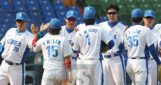 12日午後、台湾・台中のインターコンチネンタル球場で、北京オリンピック(五輪)野球最終予選の韓国-ドイツ戦が行われ、韓国が12-1でコールド勝ちした。試合後、韓国の選手が勝利を祝っている。